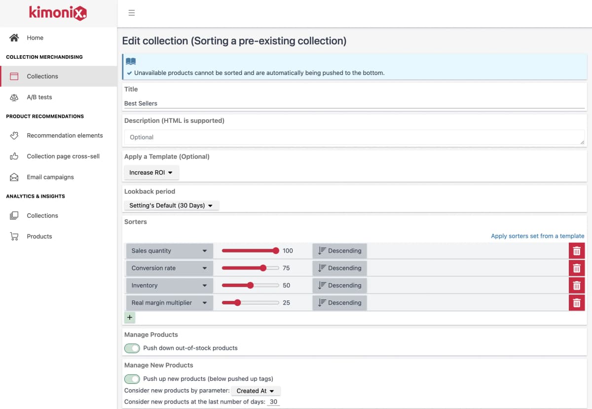 Kimonix built tailored sorting strategies for each collection using multiple parameters simultaneously: sales, conversion rates, days to finish inventory, inventory levels, and margins — each parameter ranked based on business goals.